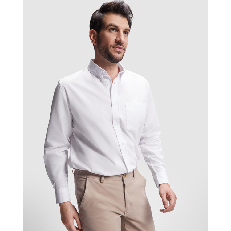 Camisa de manga comprida para homem, em popelina. Colarinho clássico engomado de 1 botão. Bolso frontal esquerdo, lapela com 7 botões ao tom e fundo boleado. Cuidado fácil.